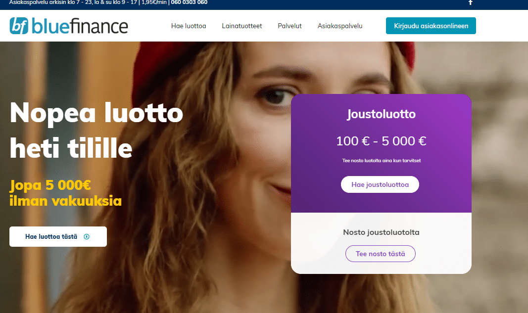 Blue Finance tarjoaa joustavaa lainaa 100 – 5000 euroon saakka. Heidän tarjoamilla lainoilla on mahdollista toteuttaa arjen unelmat tai jopa suuremmatkin hankinnat. Joustava luotto antaa vapaaseen käyttöön luottorajan 5000 euroon saakka, joka toimii luottokortin tavoin. Nostoja on mahdollista tehdä aina tarpeen mukaan tai sen voi nostaa kokonaisuudessaan. Kulut ja korot määräytyvät nostetun lainasumman mukaan. Lainoihin on mahdollista saasa maksuaikaa 1 – 44 kuukautta.